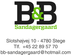 Kontakt os Kontakt os endelig på mail eller telefon. E-mail: bb-sandagergaard@hotmail.comTelefon: 22 89 57 70Adresse: Slotshøjvej 10, 4780 Stege. Find vej her.